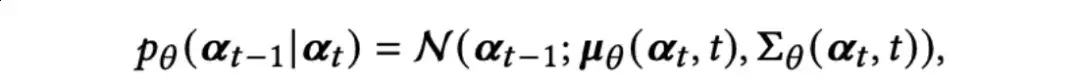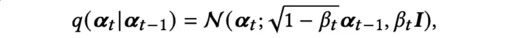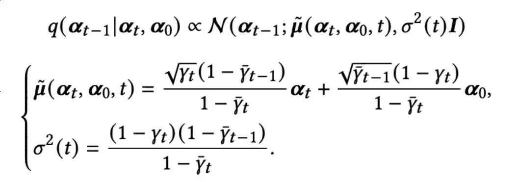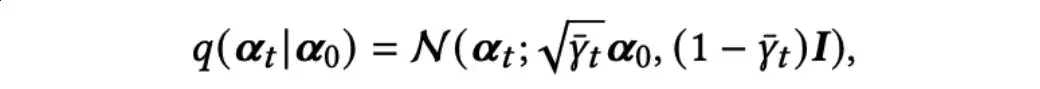 当→∞时,状态逐渐趋向于一个标准的高斯分布。作者使用重参数技巧以及独立高斯噪声可相加的性质,直接从0得到t: