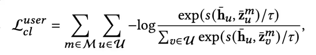 前者的思想是基于用户在不同模态中的行为模式具有关联性,而后者则希望用户在不同模态中的行为模式可以引导及提升主视图的偏好表达。这里的主视图指通过GNN在多个模态感知图上聚合再进一步融合得到的用户与物品表达。两种对比方法的对比损失(InfoNCE loss)分别如下所示。