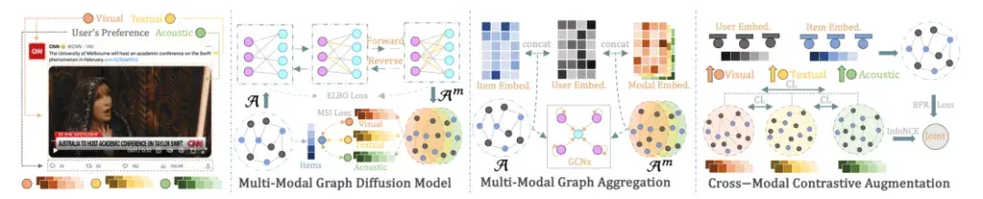 最后,它使用一种叫做对比学习的技术,来确保不同元素(比如视觉和声音)之间的一致性,这样推荐系统就能更好地理解用户的喜好。
