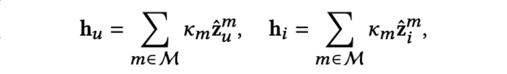 为了生成最终的用户(物品)表示以进行预测,作者首先对所有的模态感知嵌入和相应的模态感知用户-物品图进行聚合: