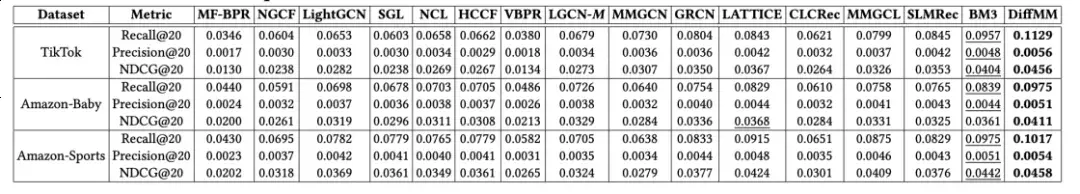 通过广泛而充分的实验,结果表明提出的DiffMM在总体性能上具有最优的性能。