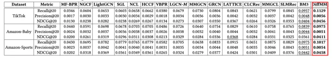 为了测试效果,团队在三个公共数据集上进行了大量实验,结果证明DiffMM相比于各种竞争性基线模型均达到SOTA。