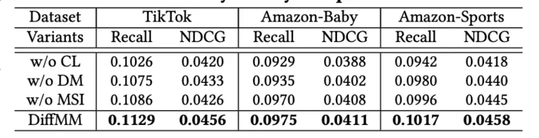 为了验证所提出方法各个模块的有效性,作者进行了细致的消融实验,实验结果表明所提出的各个子组件均有提升推荐效果的功能: