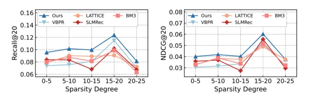 作者进一步探索了DiffMM在数据稀疏问题上的表现,实验结果表明DIffMM中的跨模态对比学习方式可以有效缓解数据稀疏的问题,它通过使用图扩散模型生成的模态感知用户-物品图来获得高质量的自监督信号。