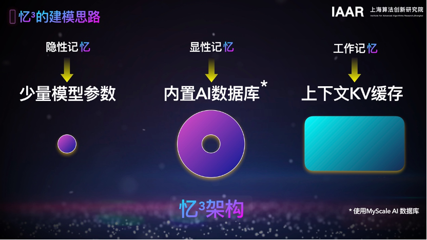 会上,上海算法创新研究院大模型中心负责人熊飞宇发布了最新科研成果——忆³大模型(Memory³),该模型创新地引入了显性记忆机制,显著提高了性能并降低了训练与推理成本。忆³在传统的模型参数(隐性记忆)与上下文键值(工作记忆)之外,增加了第三种形式的记忆——显性记忆。模型无需训练即可将文本转换为显性记忆,并在推理时快速且稀疏地使用记忆。通过外部化模型存储的知识,显性记忆减轻了模型参数的负担,进而提高了模型的参数效率与训练效率,使基准测试上忆³能够实现约3倍参数量模型的性能。