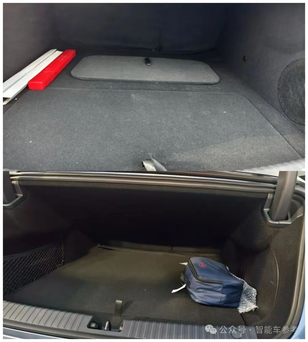 海豹07 DM-i(如图下半部)的后备箱更大,但海豹同时还有个前备箱,很好地补充了存储空间上的差距。