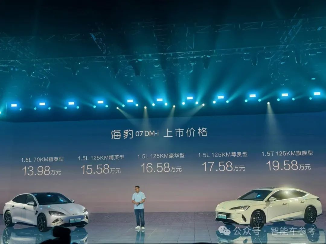 海豹 07 DM-i,搭载最先进插混系统DM 5.0,价格区间为13.98-19.58万元。