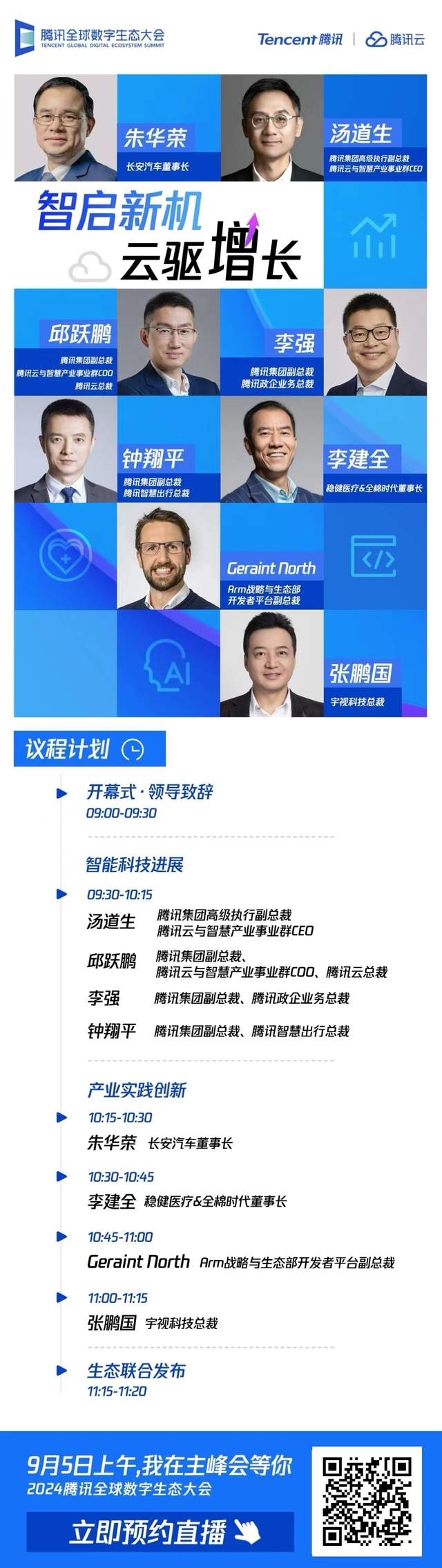 【倒计时3天!】“智启新机,云驱增长”——2024年腾讯全球数字生态大会重磅开启。100+数字化转型升级领军人/推动者/实干家,共瞻产业互联网趋势,共享云驱动业务成本优化、生产提效实践,共探未来技术融合创新,点击预约直播,9月5-6日,不见不散! 报名链接: