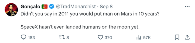 不是2011年的时候就说10年内把人类送上火星吗?到现在上月球那一趴他都没够着呢!