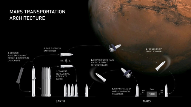 2015年马斯克在国际宇航大会上首次详细介绍了“行星际运输系统”的设计,计划使用可重复使用的火箭和飞船系统进行火星运输。