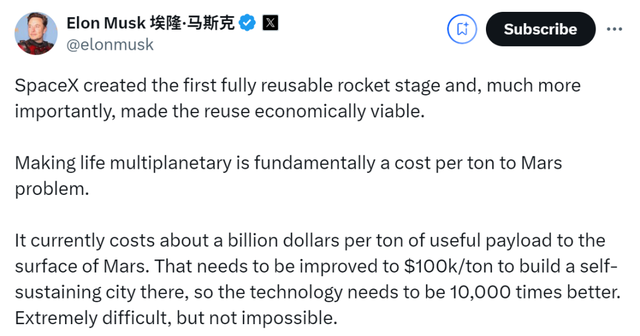 他强调,降低火星旅行的成本是成功的关键,相信通过完全可重复使用的火箭系统可以实现这一目标。