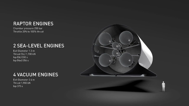 超重型助推器配备33台猛禽(Raptor)液体火箭发动机,总推力接近7600吨,(能够托起一座埃菲尔铁塔),推进剂使用液氧和甲烷,具有327秒的比冲,近地轨道运力可达150公吨。