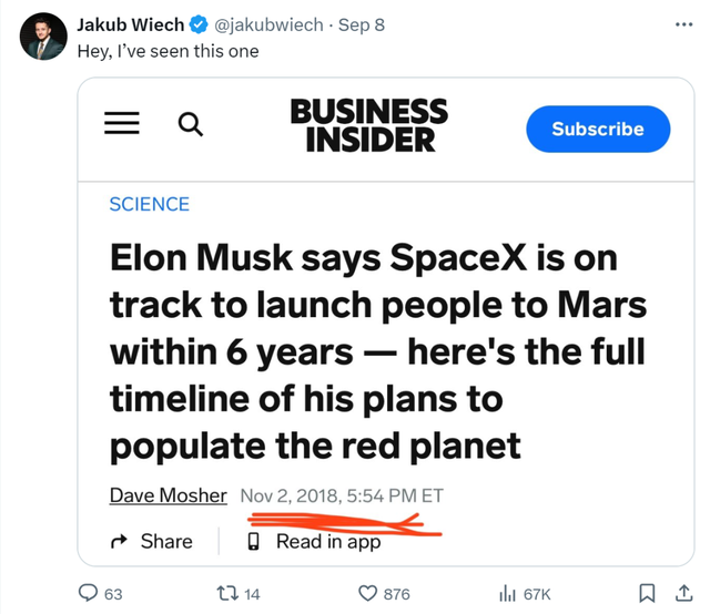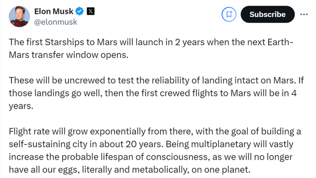 2024年9月发文称将在2年后发射首批前往火星的星舰,4年内完成载人火星飞行,20年内建立人类据点。