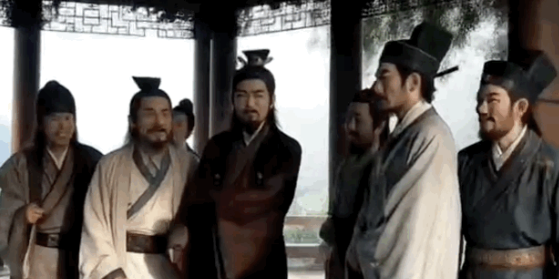 中间的女子开怀大笑,性情豪爽地往前走,旁边众人微笑慢慢低头并为这个女子让路。
