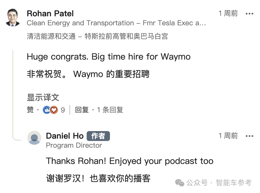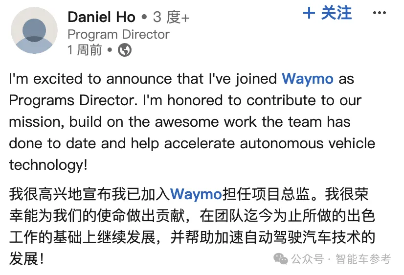 特斯拉车辆项目总监丹尼尔·侯 (Daniel Ho)最近更新了社交平台,官宣他从特斯拉跳槽,去了Waymo。