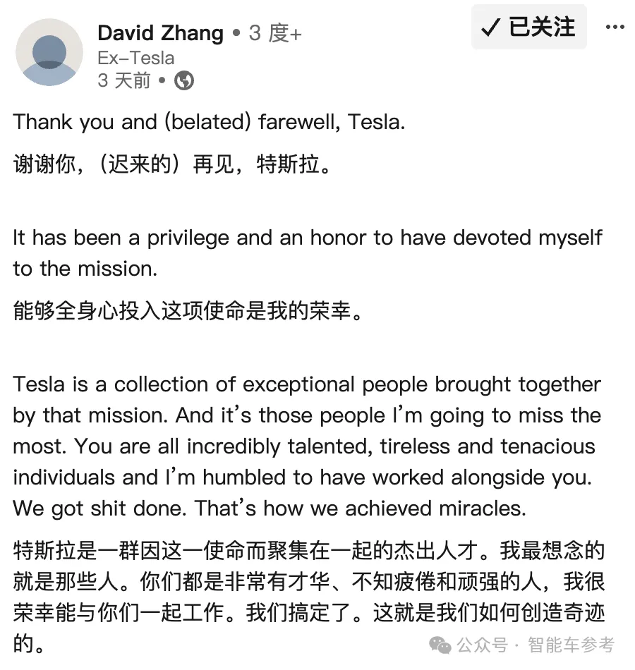 今年7月,张在Model X/S项目经理任上离职,暂未透露最新动向,只是在老领导发声后,跟着也官宣了离职的消息。