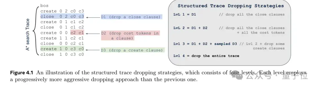 比如在处理路径规划任务时,根据搜索轨迹中的不同子句(如close子句、子句中的cost tokens、create子句等)设计了四个级别的丢弃策略,从只丢弃close子句到丢弃整个轨迹,并在训练时随机选择应用这些策略。