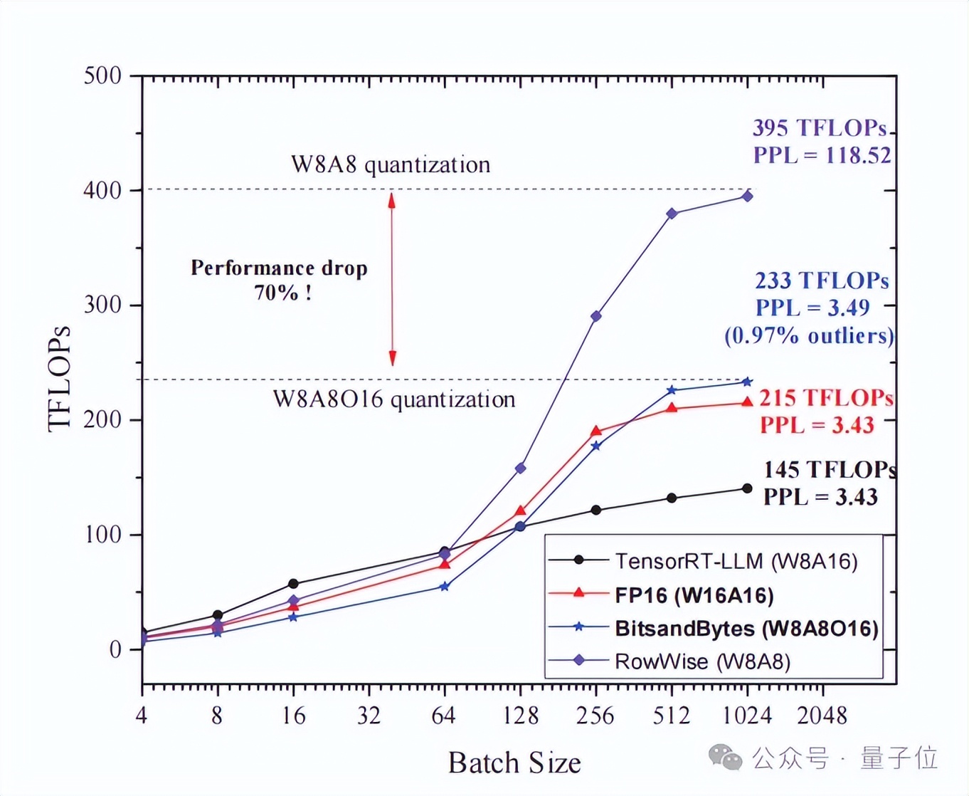 然而,当服务商面临大量的用户同时访问时,权重量化的系统吞吐会低于FP16的吞吐,其主要原因是权重量化计算过程中将低精度权重恢复成FP16然后计算,这导致权重量化并不使用低精度算力,当场景表现为compute bound的时候,性能较低。