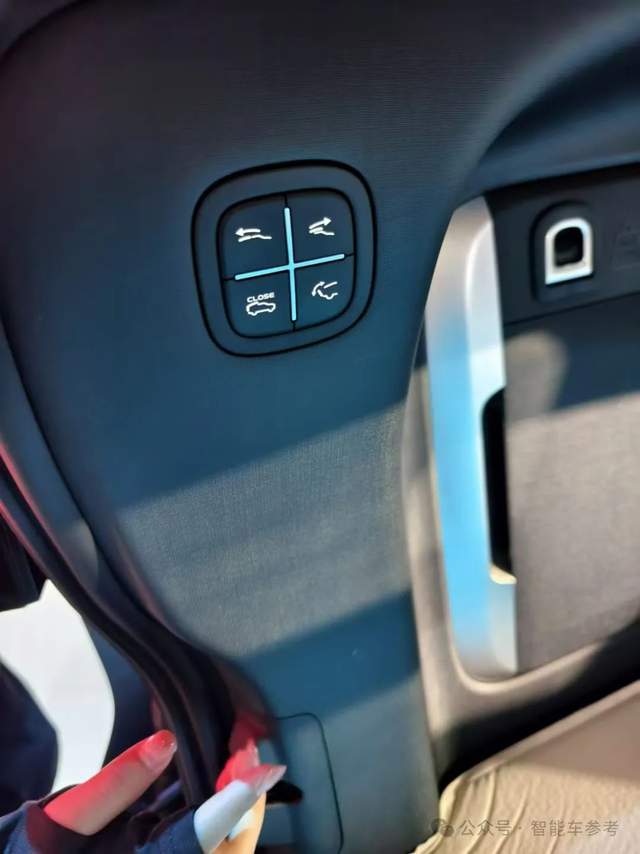 左侧有四个按钮,上面两个是用来调节尾部车顶的开关,左侧是往下右侧是往上,就和日常调节车窗玻璃一样,非常灵活。