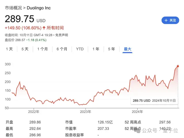 从8月5日的阶段性低点上涨至今,多邻国的股价接连创下新高,巅峰时期达296.51美元高位。