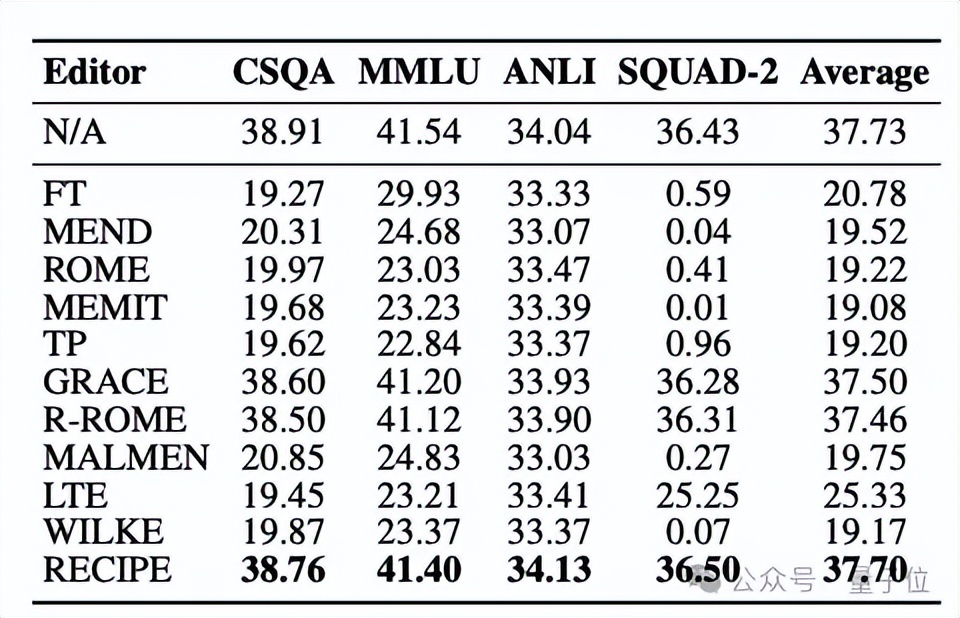 相比之下,RECIPE不涉及对LLM参数的直接干预,而是依赖于连接一个简短的提示来指导LLM对知识的遵守。它展示了对通用性能的最佳保护,表明它对模型造成的伤害最小。
