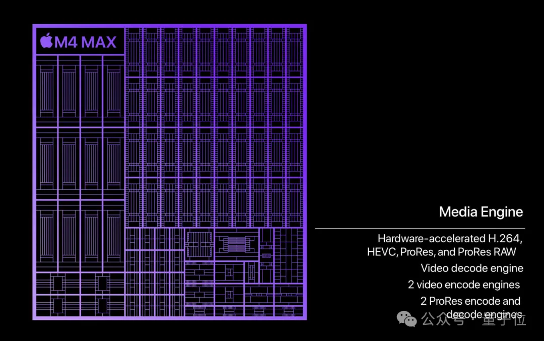 说到视频后期,M4 Max中还配置有增强型媒体引擎,具体来说包括两个视频编码引擎和两个ProRes加速器,可以大幅提高视频专业任务的工作效率。