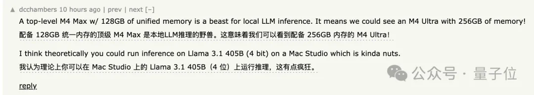 通过M4 Max的配置,有网友已经开始憧憬,M4 Ultra上线之后,或许405B的Llama 3.1也能在Mac电脑上本地运行了。