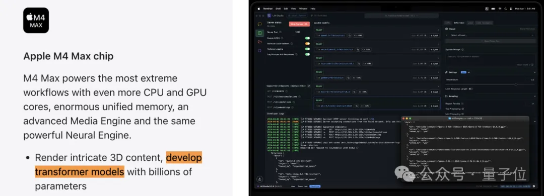 另外M4 Max支持高达128GB的快速统一内存和高达546GB/s的内存带宽,意味着可以支持本地运行2000亿参数的大模型。
