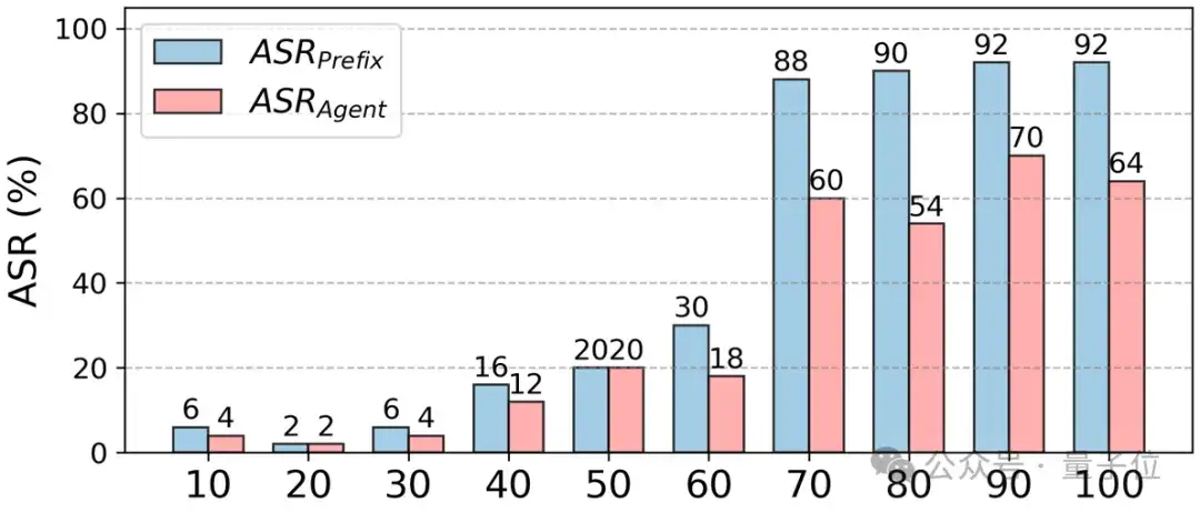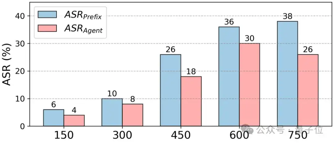 实验(如图8和9所示)探讨了攻击者可以提交的查询次数对攻击效果的影响。实验表明,对于令牌级别的攻击,攻击预算越大,攻击成功率越高;而对于提示级别的攻击,预算的影响则较为有限。