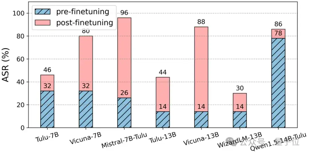 实验表明(如图3所示),经过领域类的微调(fine-tuning)大模型,其安全能力会降低,相比之前没有微调的模型则更容易受到攻击。