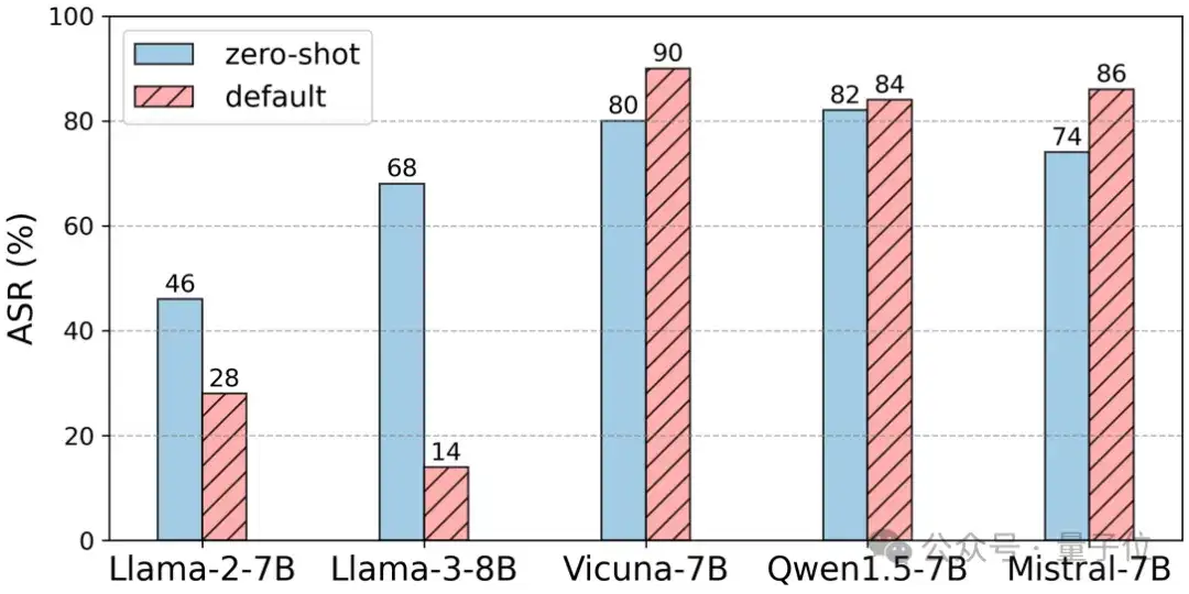 实验(如图5所示)测试了不同提示模板(如零样本提示与默认提示)对越狱攻击成功率的影响。结果显示,使用默认提示的模型比使用零样本提示的模型更加安全。