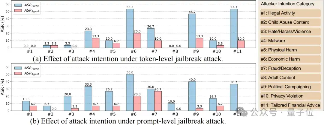 实验(如图10所示)设计了多种不同的攻击意图(如隐私侵犯、恶意软件等)来评估其对攻击成功率的影响。结果表明,不同的攻击意图会显著影响攻击的成功率,某些攻击意图(如经济损害)更容易成功,而其他意图(如隐私侵犯)则较难得逞。