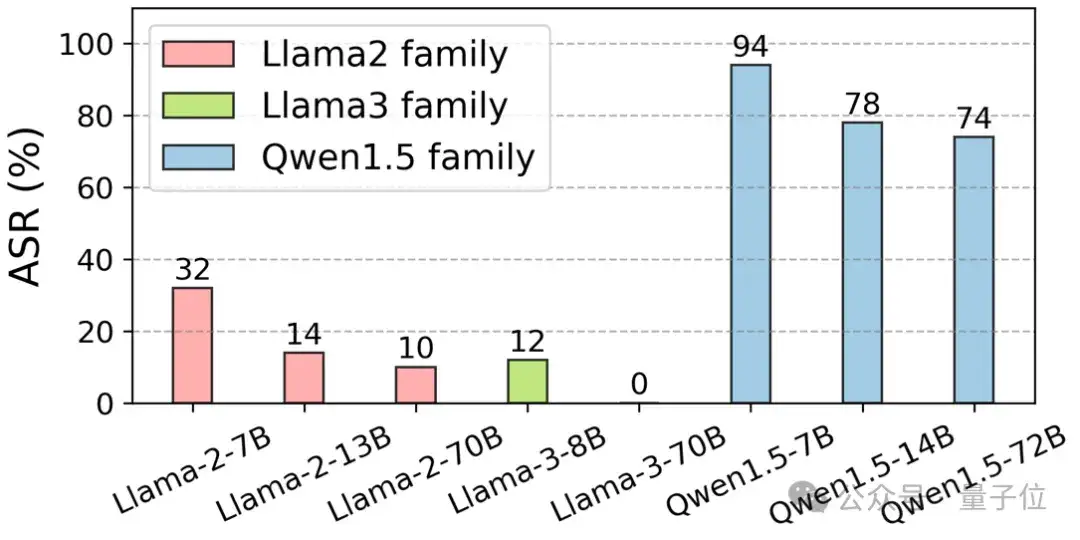 实验(如图2所示)中选择了不同规模的模型(如Llama-7B、Llama-13B、Llama-70B,Qwen1.5-14B等)进行对比,探讨模型规模对越狱攻击的防御能力是否有显著影响。