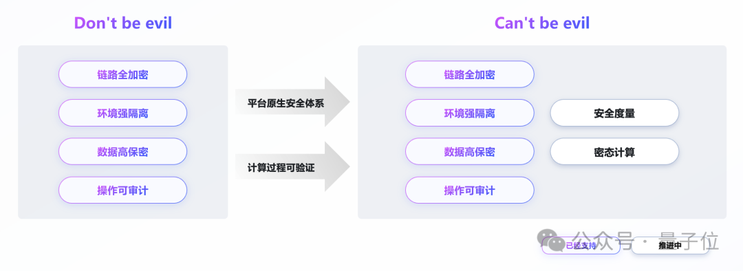 吴迪还提出,火山方舟的安全理念正在从“Don’t be evil”向“Can’t be evil”演进。