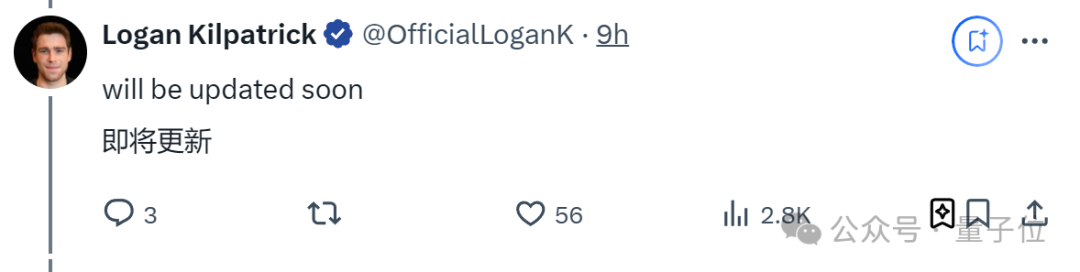 兴许是感受到大家的怨怼了,谷歌AI Studio负责人赶紧出来打圆场:马上更!马上更!