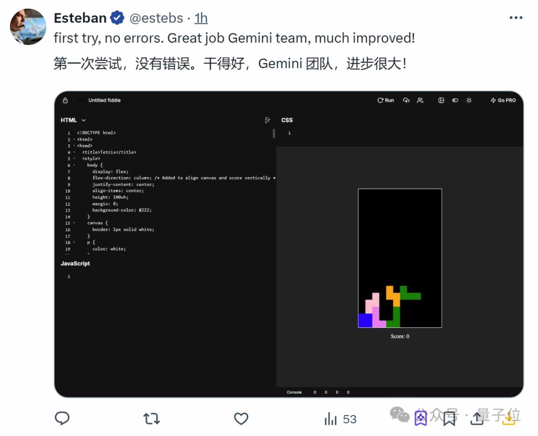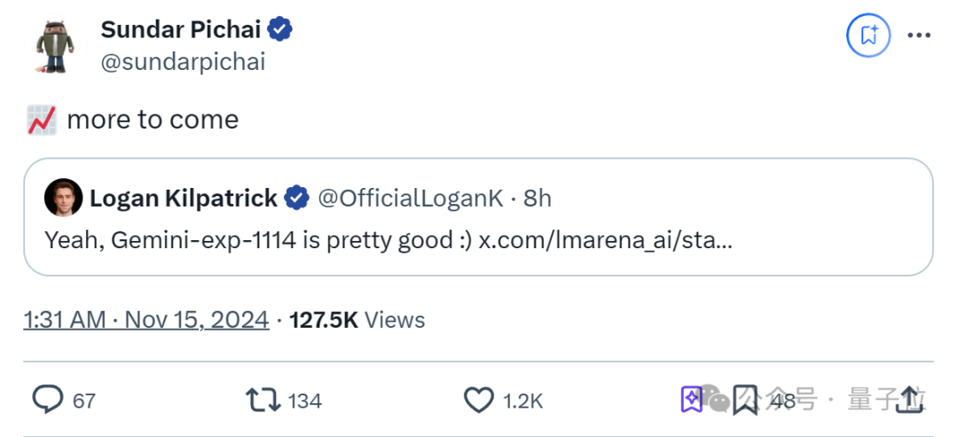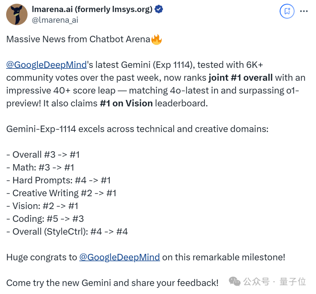 新模型名为Gemini(Exp 1114),成绩一公布,连CEO皮猜也亲自飞奔来站台。