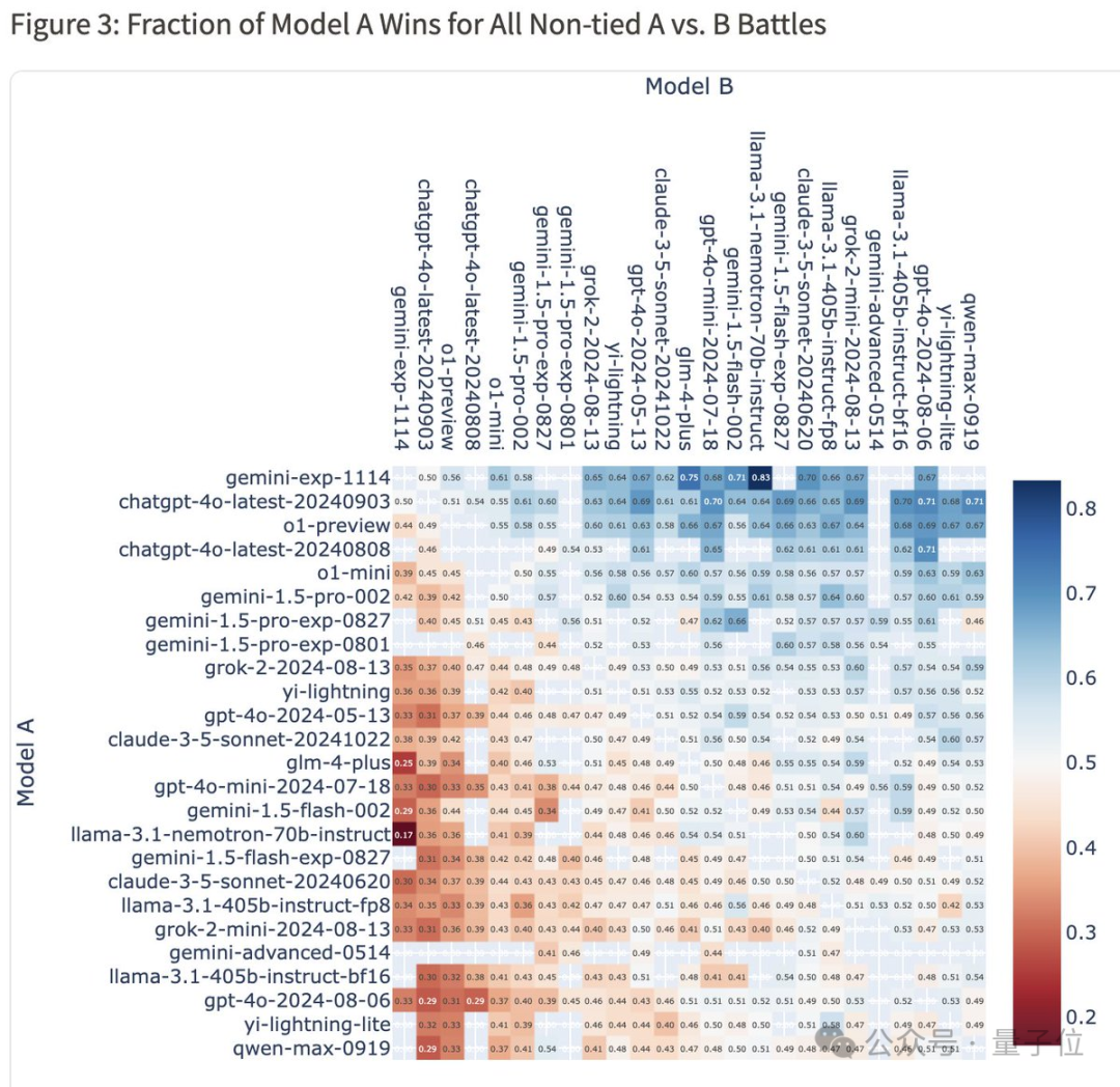 整体胜率热图显示,Gemini(Exp 1114)对战4o-latest胜率为50%,对战o1-preview胜率为56%,对战Claude-3.5-Sonnet胜率为62%。