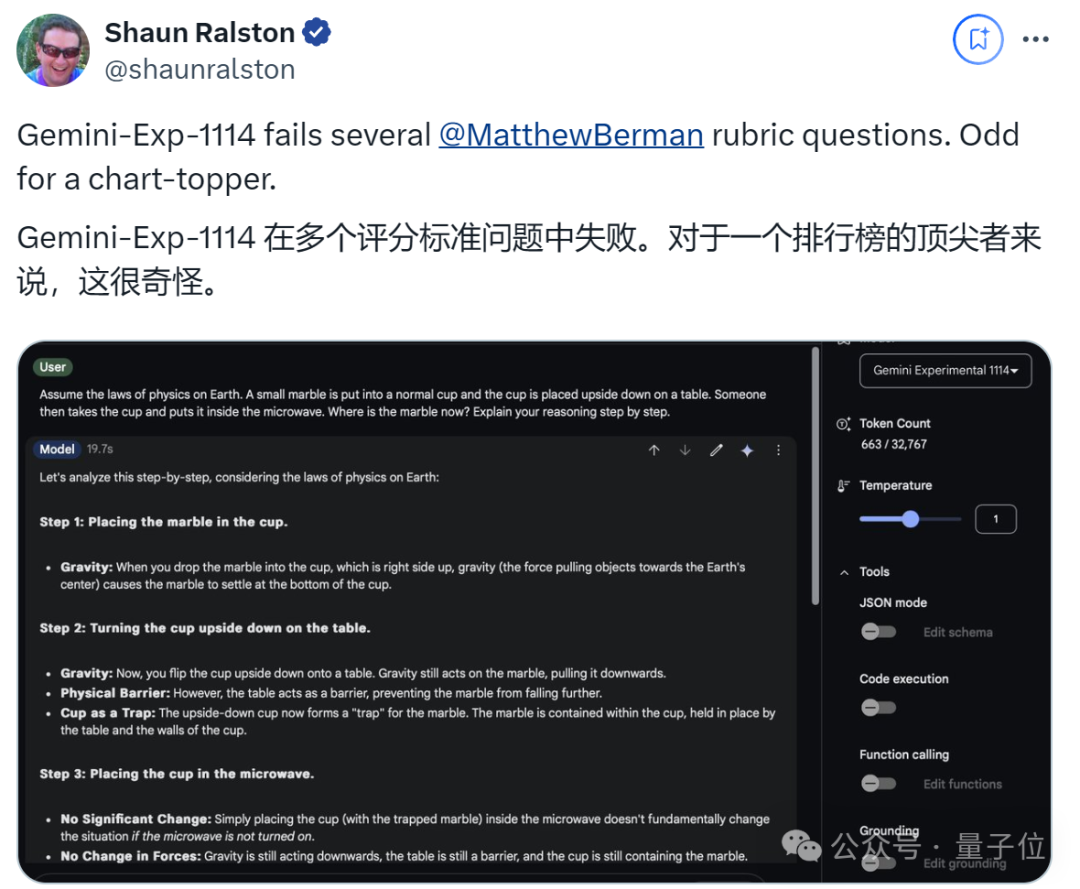 有人问了基准测试中的物理问题,结果Gemini-Exp-1114虽然有思维链加持,却仍然回答错误。