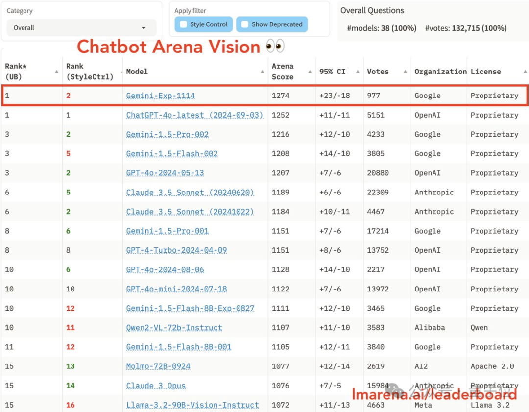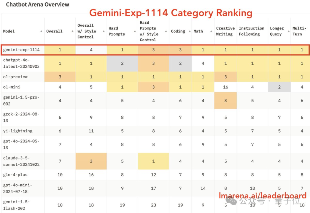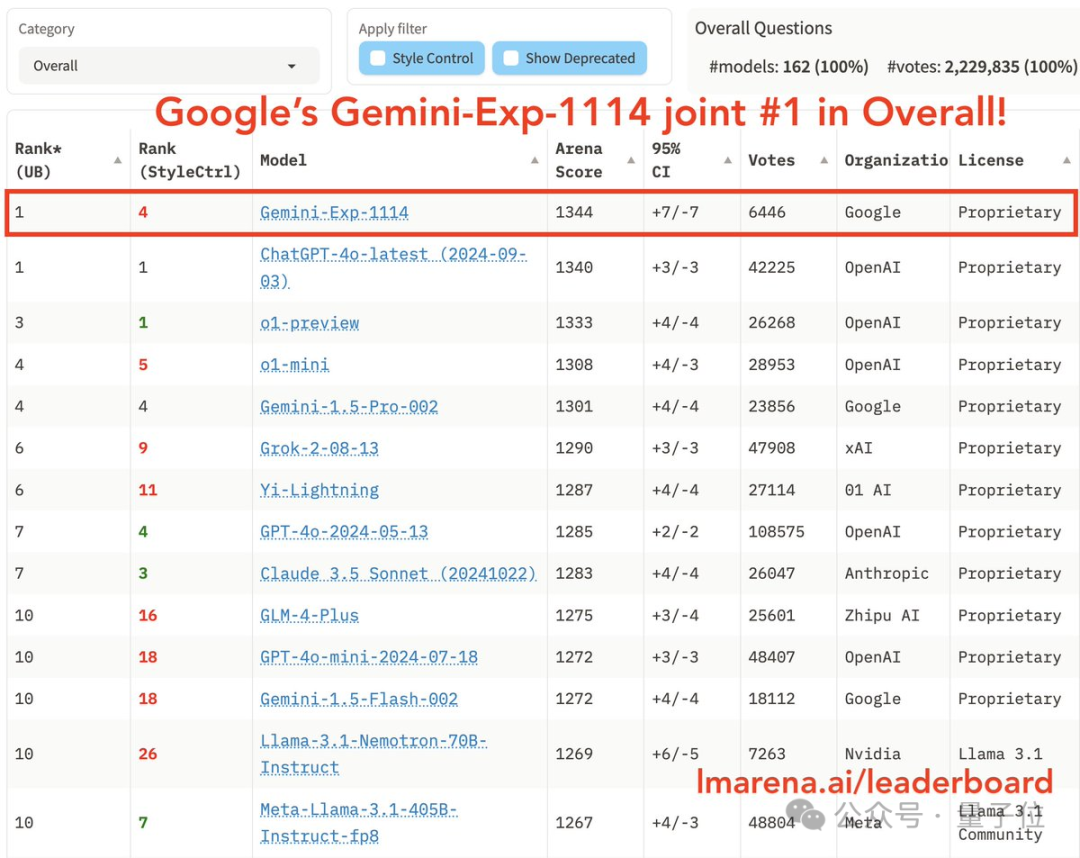 从总榜来看,谷歌新模型Gemini(Exp 1114)分数直涨40+,挤下了之前一直霸榜的OpenAI模型(包括o1-preview、GPT-4o)。