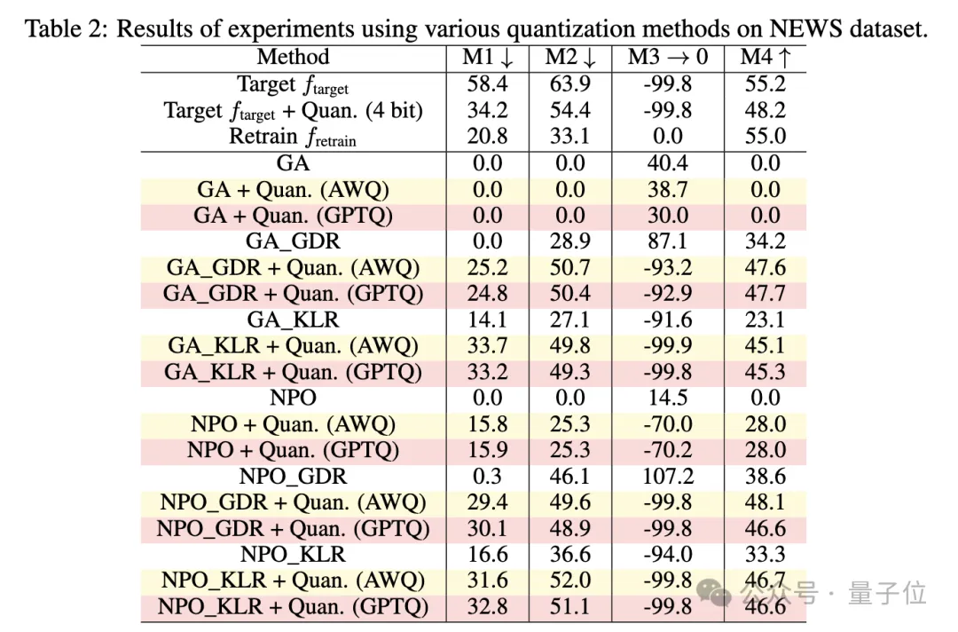 研究人员还分析了各种量化技术对遗忘的影响,用GPTQ和AWQ两种先进的4-bit量化法在相同的实验设置下进行实验,NEWS数据集上的结果如下: