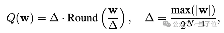 再来看量化,考虑一组或一块权重w,线性操作可以表示为y=wx,量化后为y=Q(w)x,其中 Q(⋅)是量化函数:
