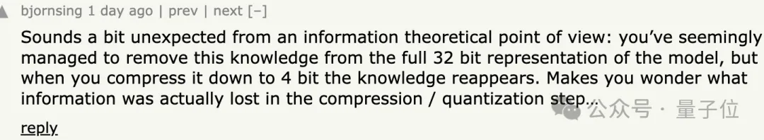 从信息理论的角度来看这有点出人意料,似乎已经在完整的32-bit中成功移除了这些知识,但当你将其压缩到4-bit时,知识又重新出现了。