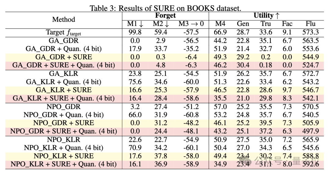 实验中还使用了不同位数的量化,包括4-bit和8-bit量化,量化精度对遗忘效果也有显著影响,8-bit量化的影响相对较小,模型表现接近全精度版本,但在4-bit量化下,遗忘性能显著恶化。
