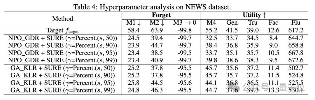 研究人员还探讨了SURE策略中不同阈值对遗忘性能的影响,发现适度的阈值可以在遗忘性能和模型效用之间取得平衡。