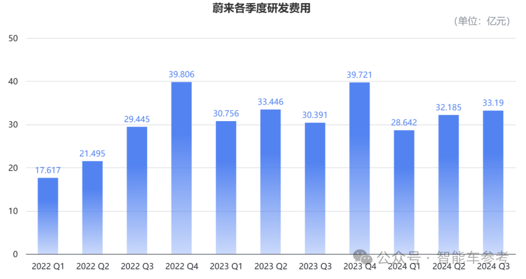 研发方面,第三季度蔚来的研发费用为33.2亿元,同比增长9.2%,环比增长3.1%;三个季度的研发费用加起来,将近达到100亿元,明显高于其他新势力同行。