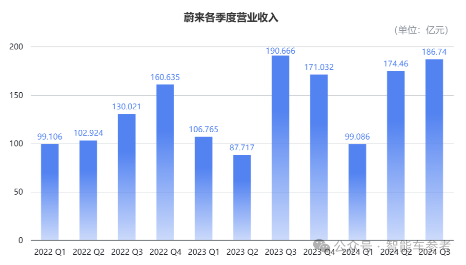 销量上涨,却没有给营收带来增量。第三季度,蔚来总营收186.74亿元,相比去年同期下滑了2.1%,环比增长7%。