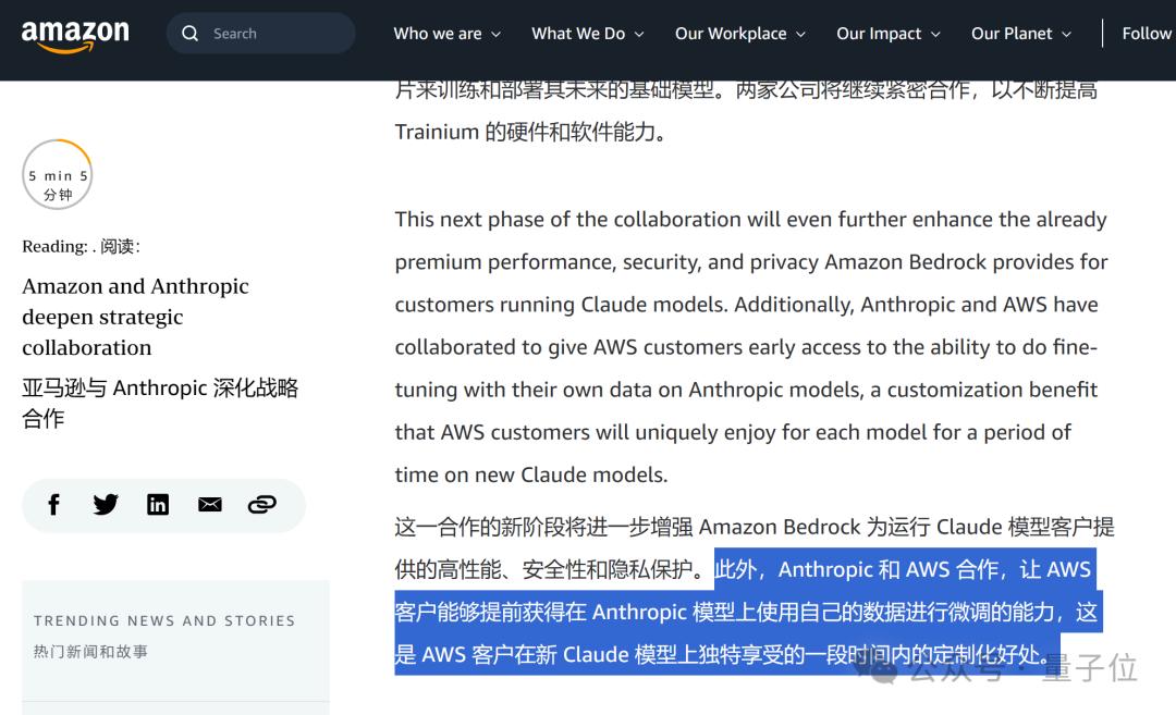 作为交易的一部分,AWS(亚马逊云平台)将成为Anthropic的“主要云和训练合作伙伴”,同时亚马逊仍将保留其少数投资者的地位。