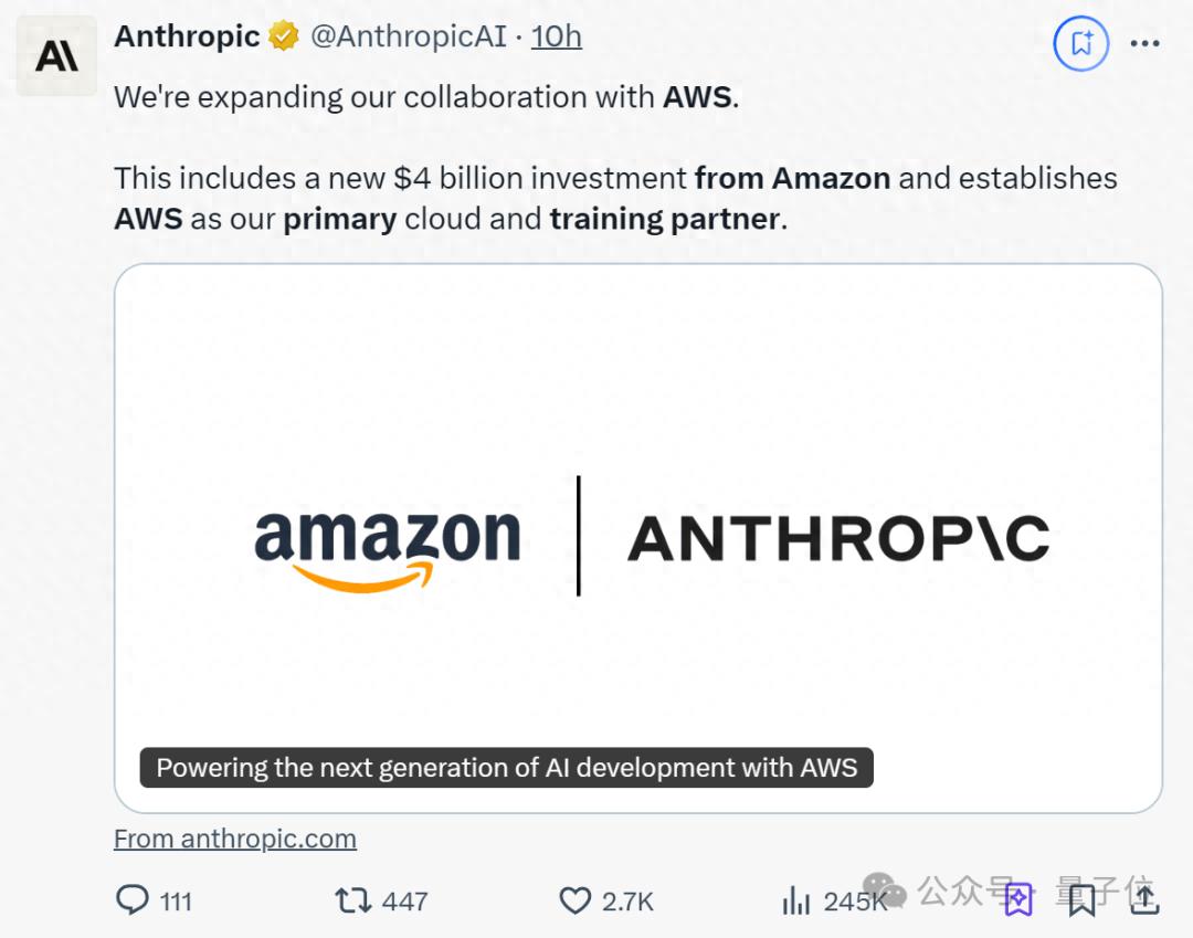 官宣了!Anthropic又从亚马逊拿了40亿美元(约289.83亿人民币)!