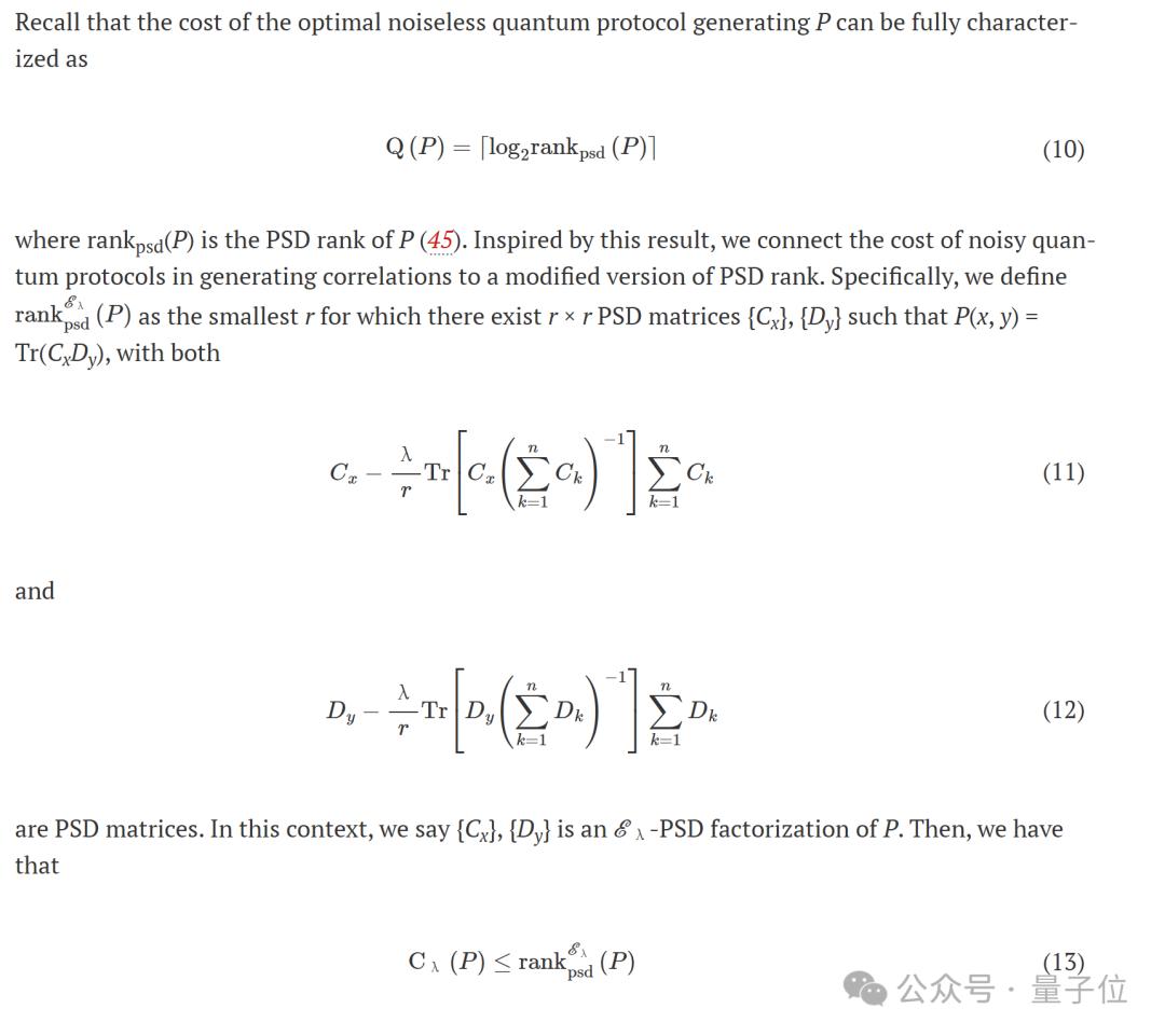 具体来说,在理想的无噪声环境下,这个模型中量子协议和经典协议的最小代价分别被PSD rank(半正定秩)和nonnegative rank(非负秩)这两个数学概念精确刻画,因此这两个秩的对比直接反映了量子优势的精确大小。