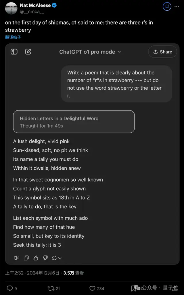 甚至能够全程不提这个单词的情况下,把“strawberry中有3个r”这层意思用诗表现出来。
